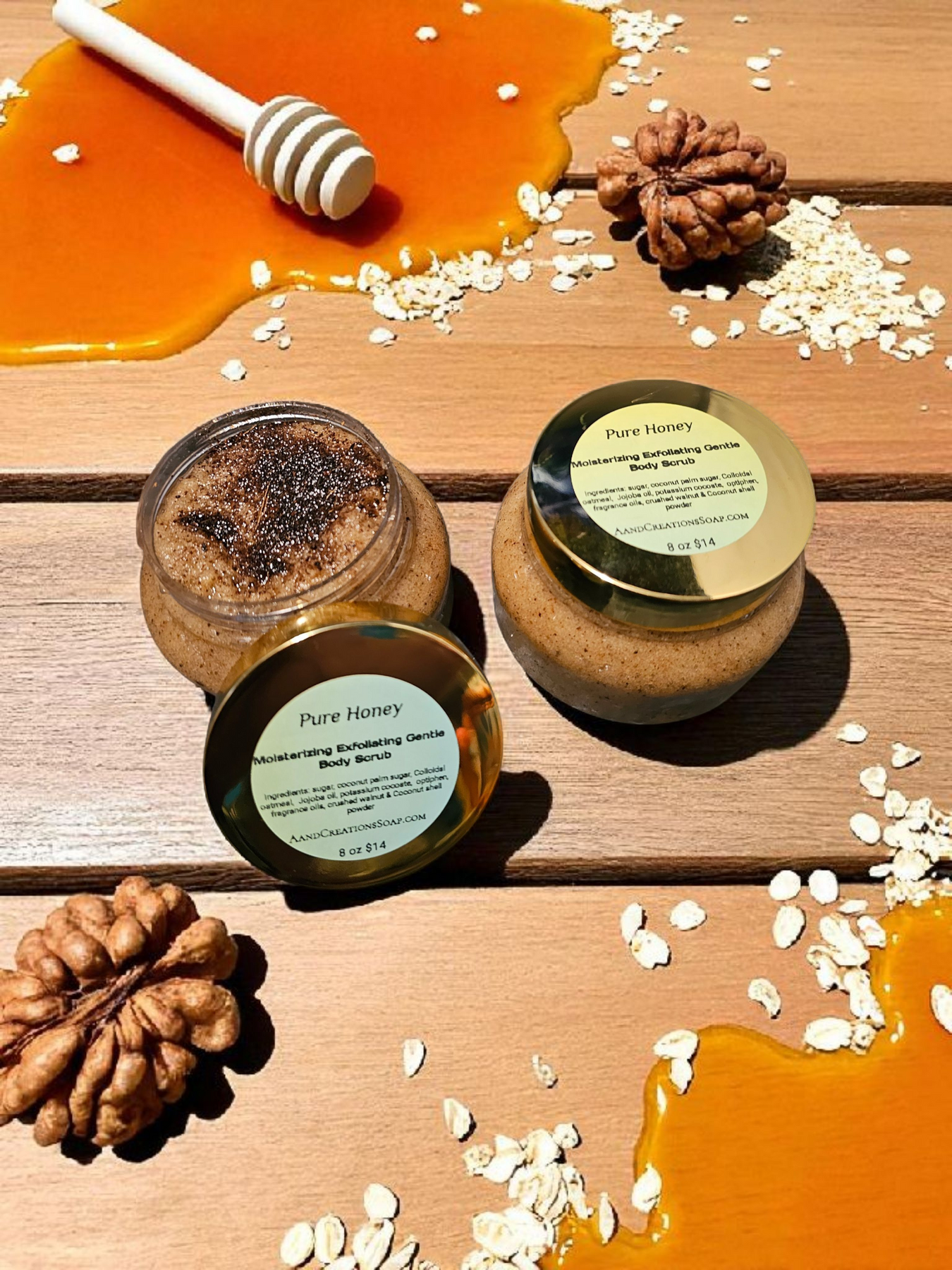 Experience the ultimate skin enriching body scrub with our Honey Oatmeal Sugar Scrub. Made with powerful ingredients like colloidal oatmeal, Jojoba oil, and honey, this scrub cleanses, moisturizes, and exfoliates for soft and supple skin. Use by itself or after washing for a 2-in-1 soap and scrub experience. Elevate your self-care routine with our signature honey fragrance.