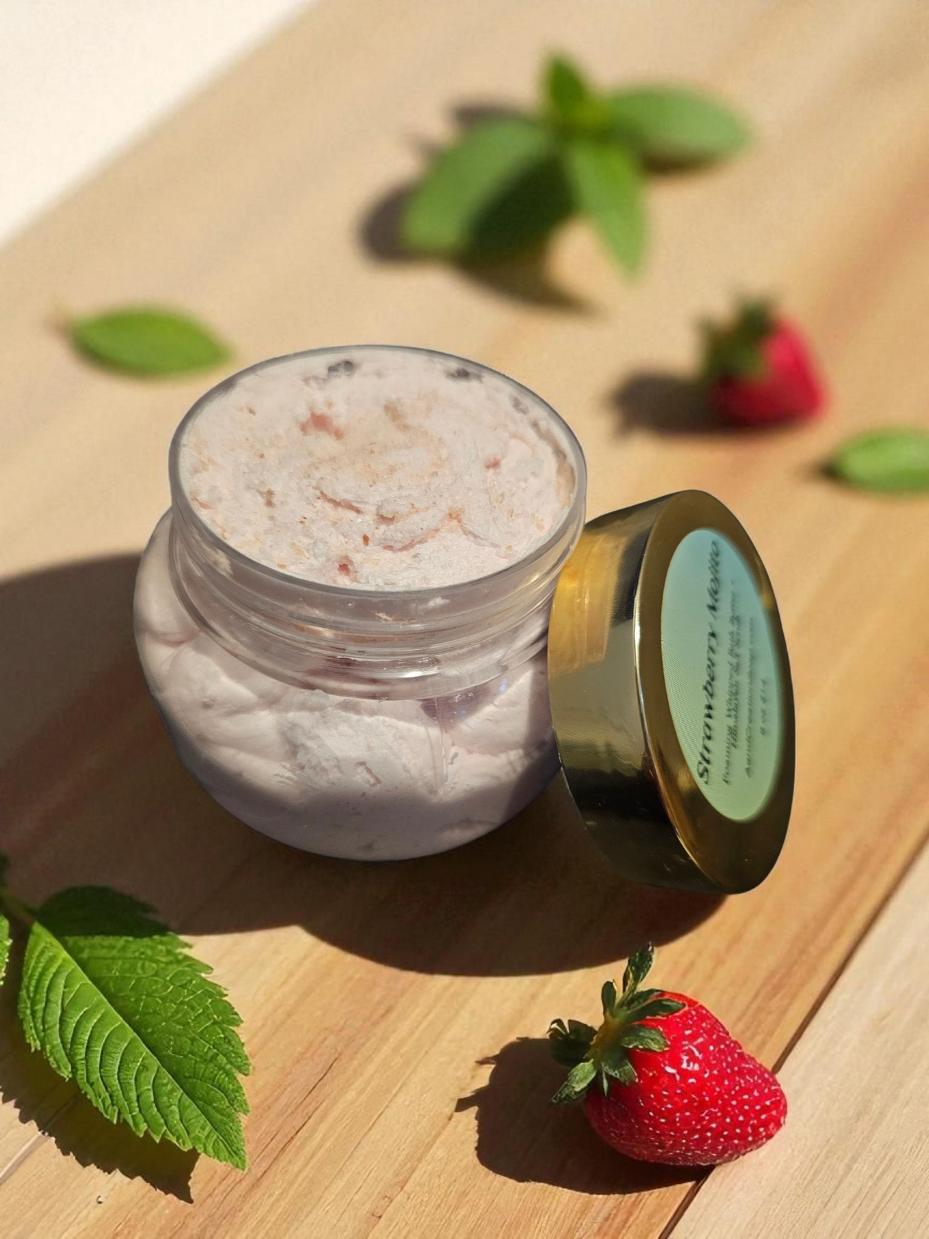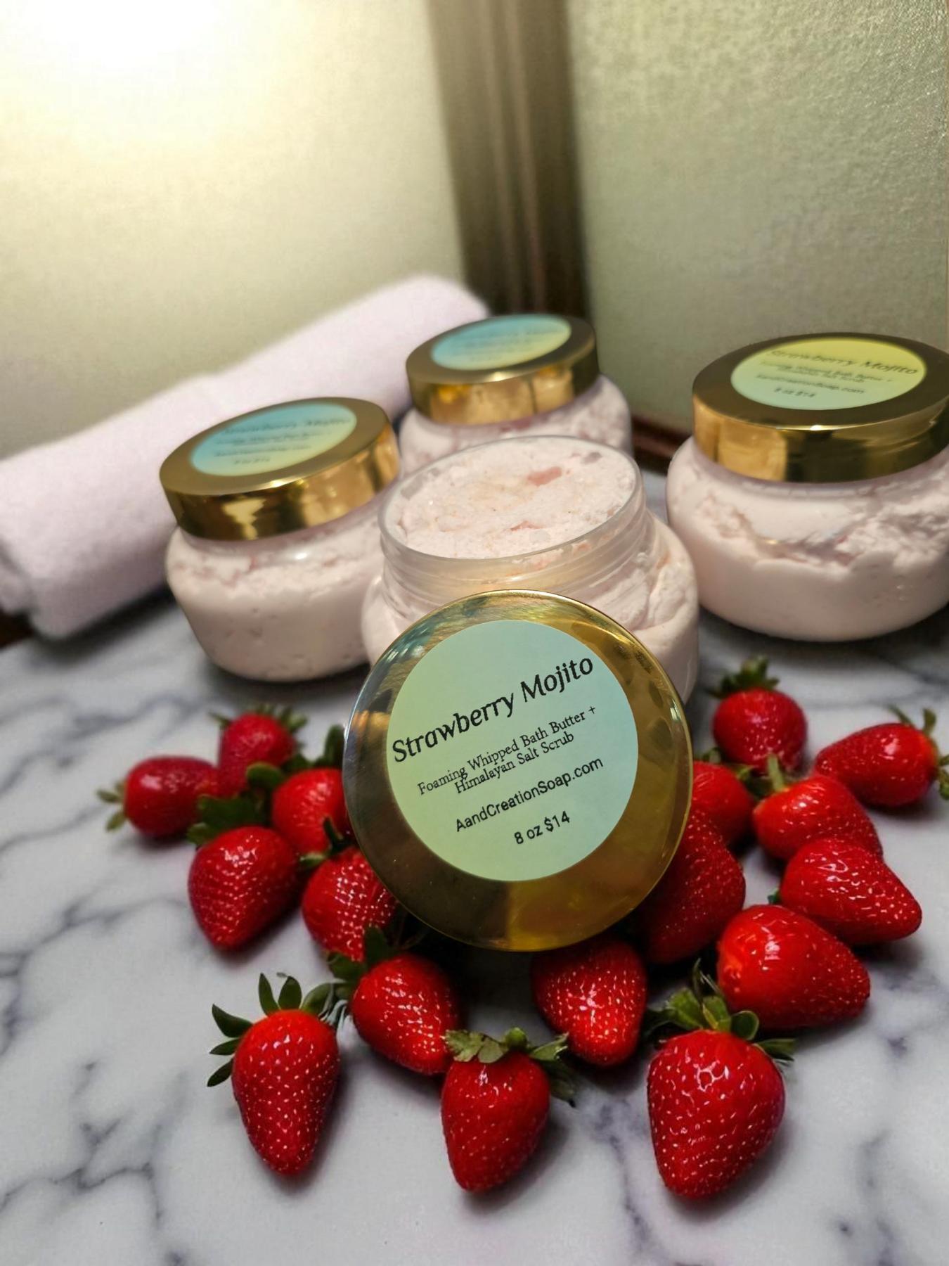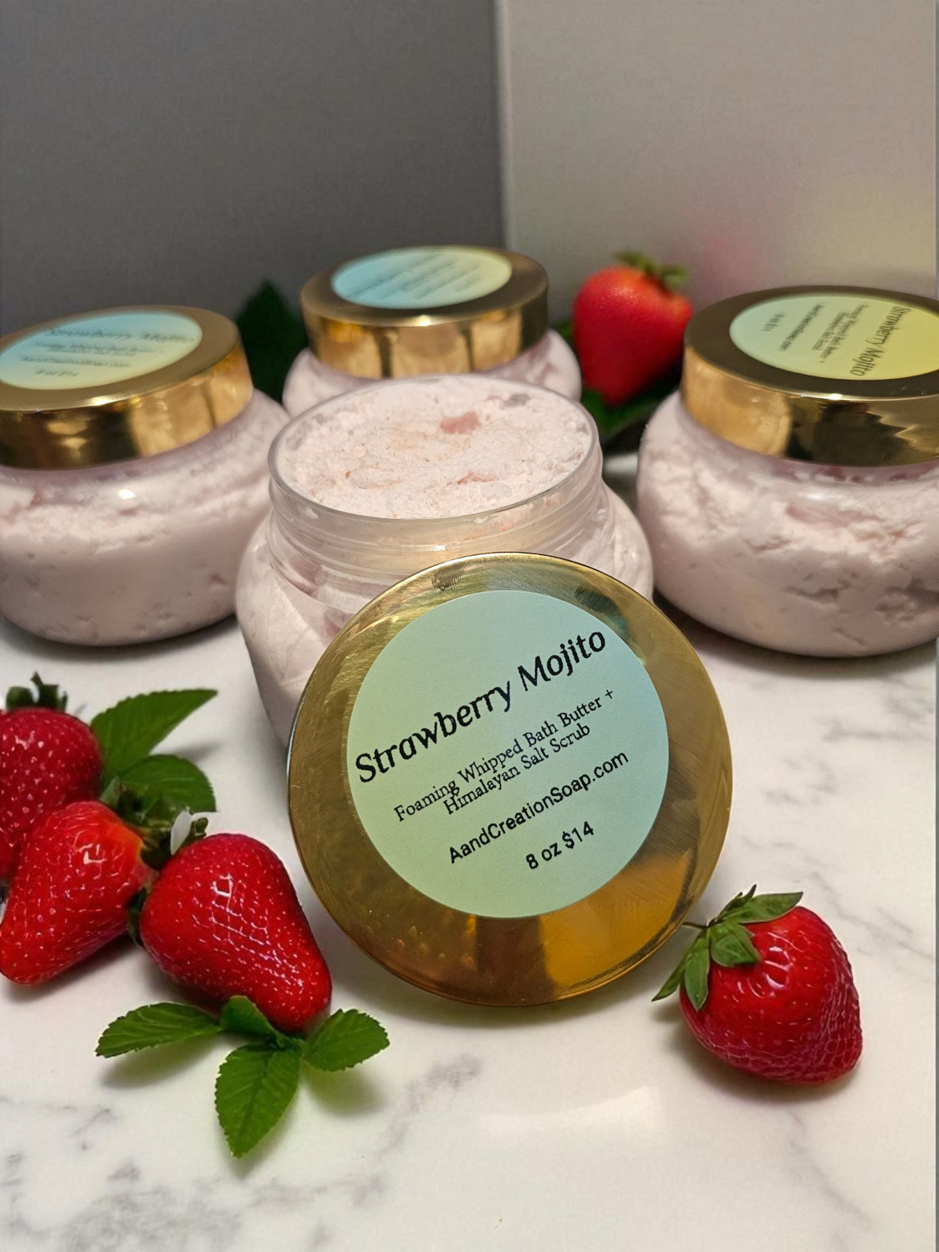 Indulge in our Strawberry Mojito Whipped Foaming Bath Butter + Himalayan salt exfoliating scrub. The intoxicating combination of our strawberry element and mint mojito fragrance oils have always been our number 1 fan favorite and a staple product in my carefully selected line.