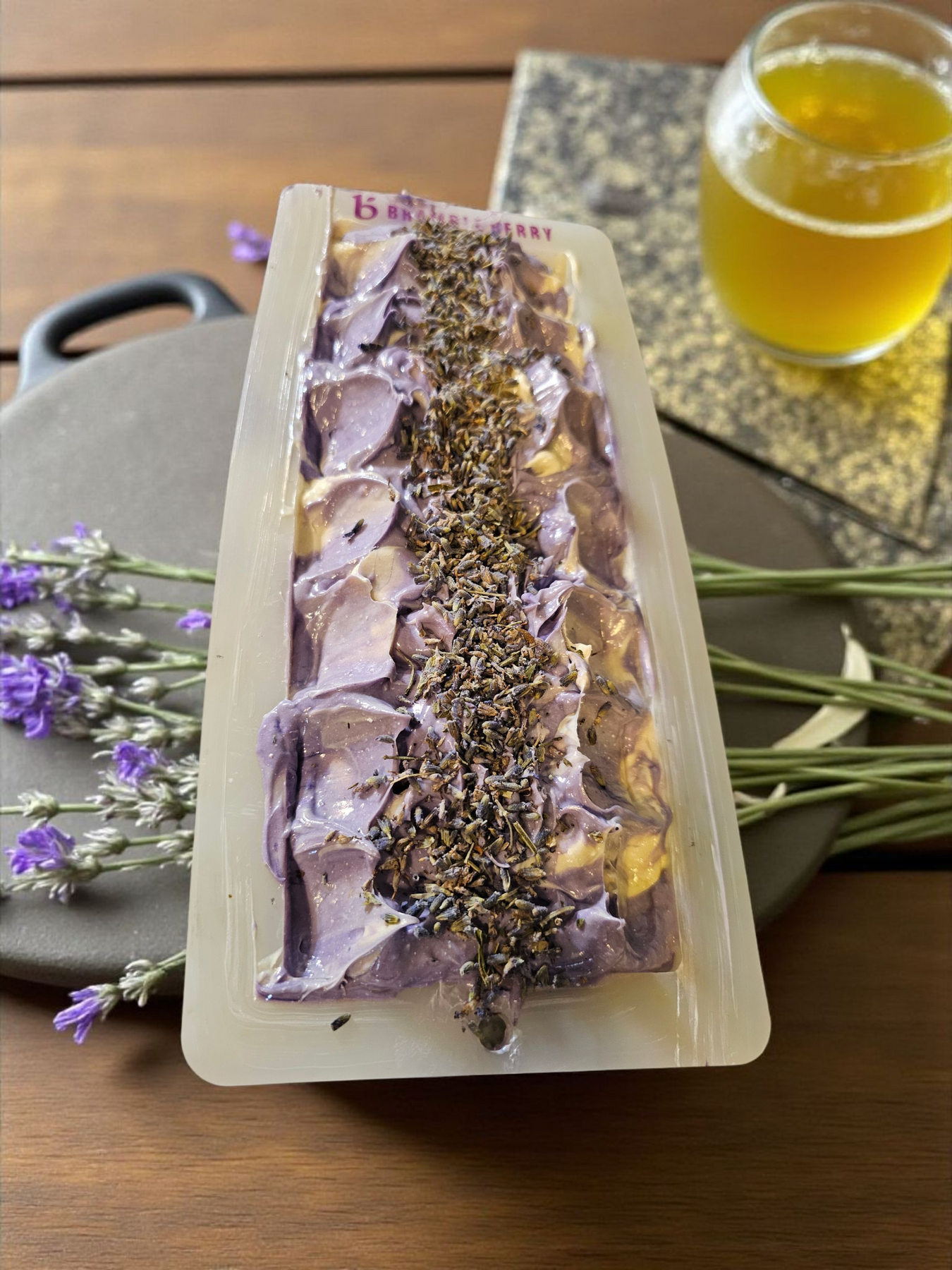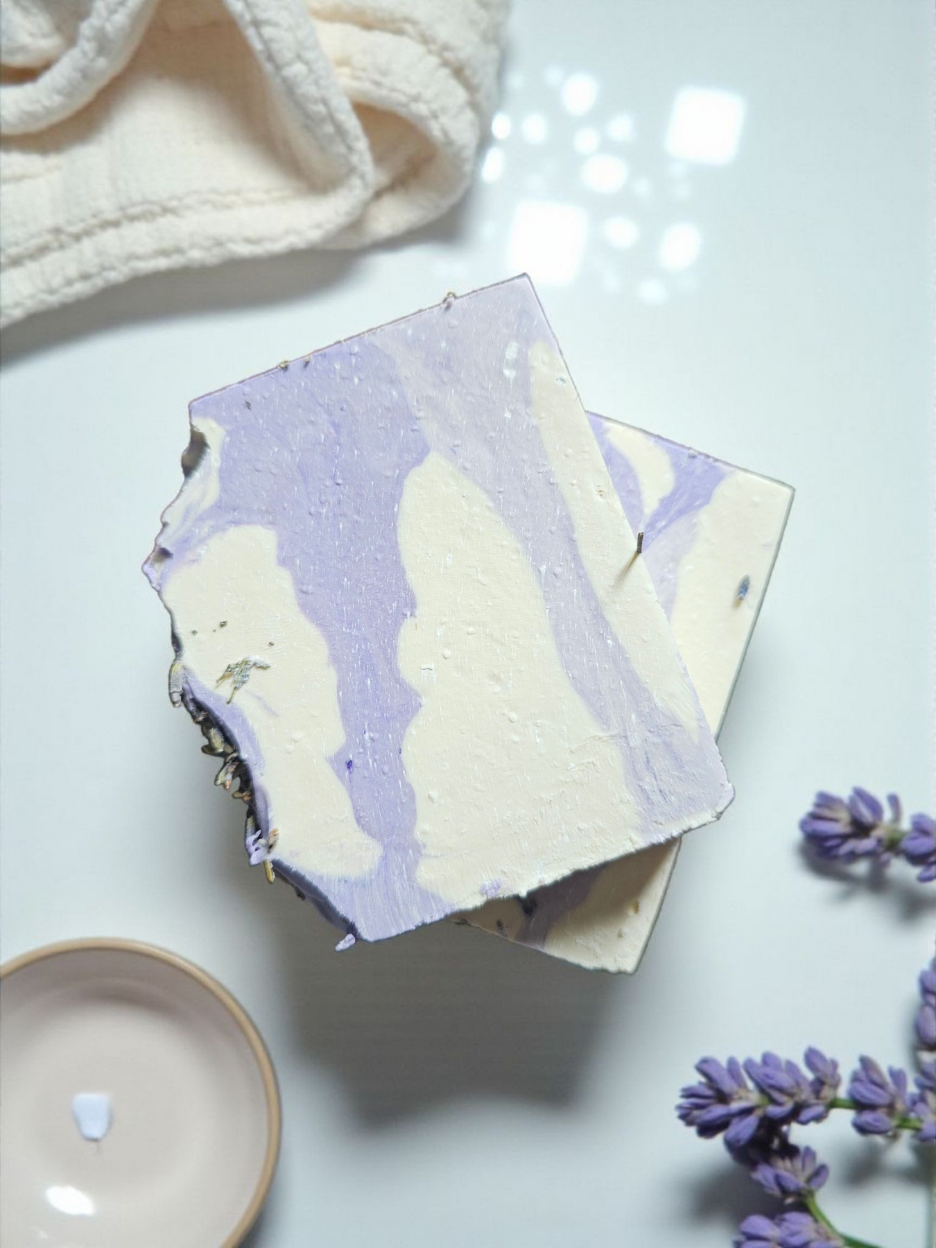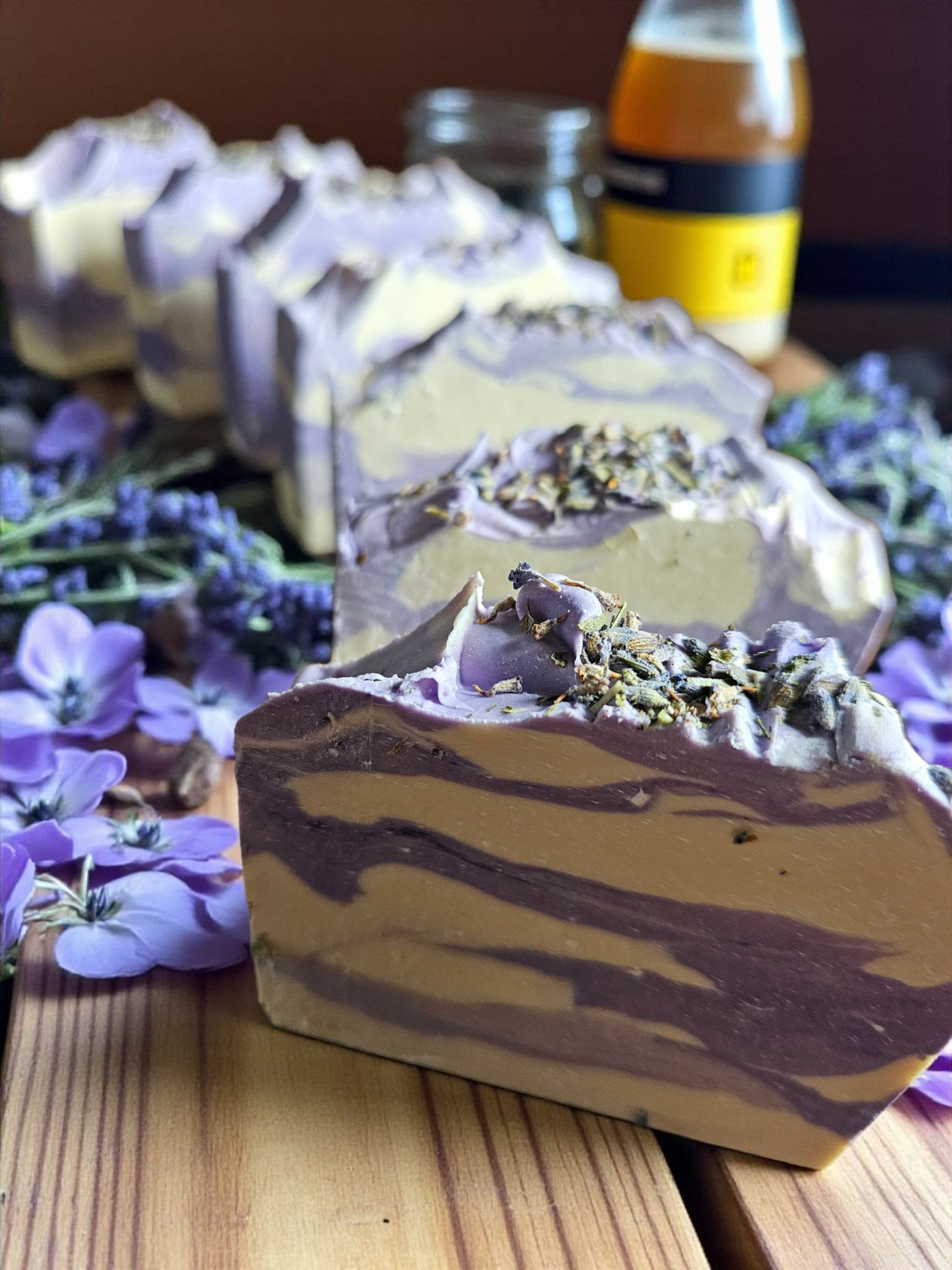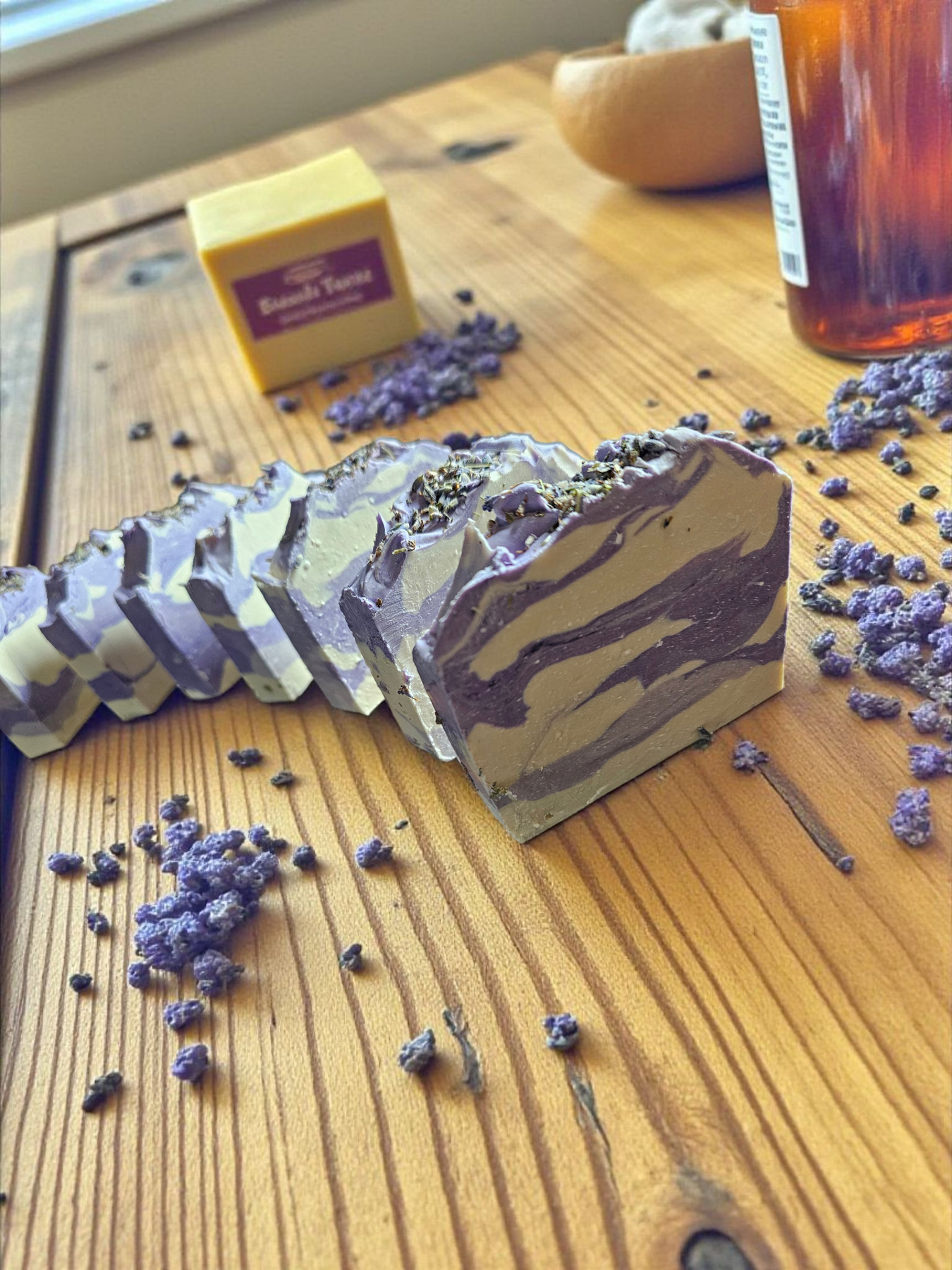 Ingredients: lavender kombucha, coconut oil, palm oil, canola oil, olive oil, sweet almond oil, Castor oil, kaolin clay, purple mica, vitamin e oil, lye, dried lavender buds