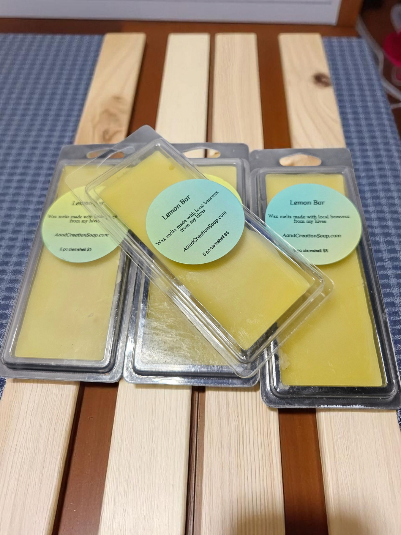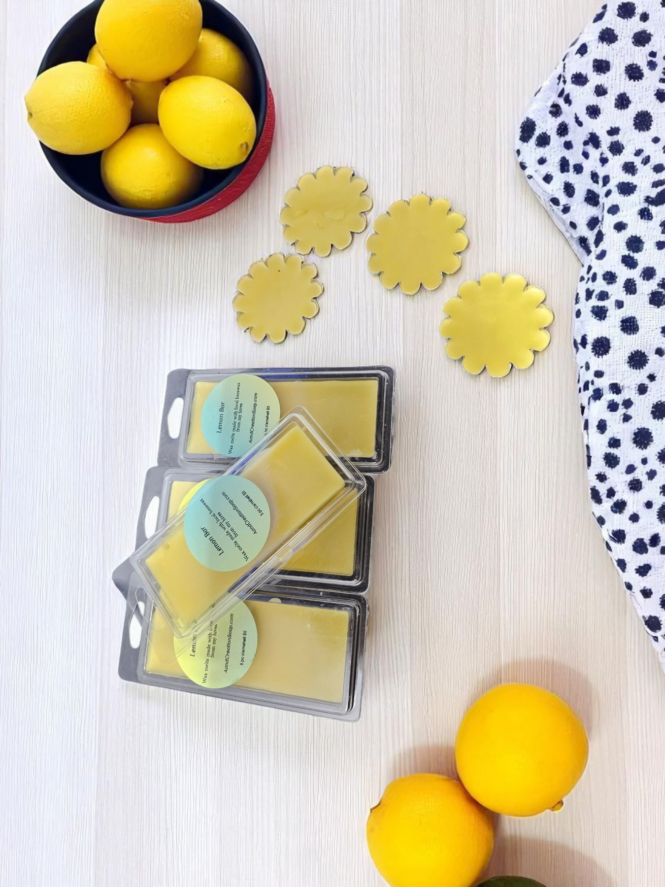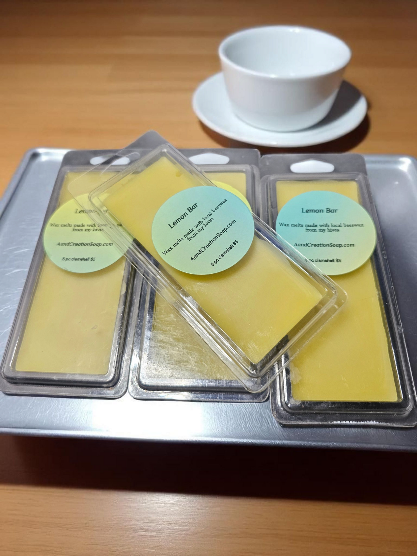 - Lemon Bar: One of our staple scents not just for wax melts, but cp soaps, body scrubs, and much more. This has a nice sweet lemony scent with undertones of rich Graham crackers type crumble. It truly smells exactly like a lemon tart!