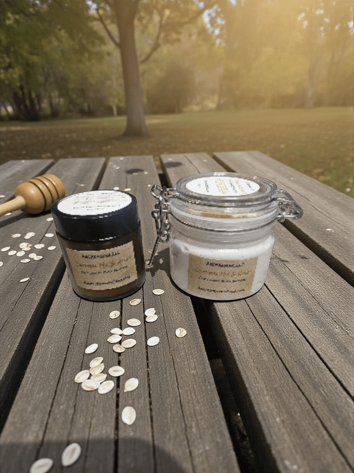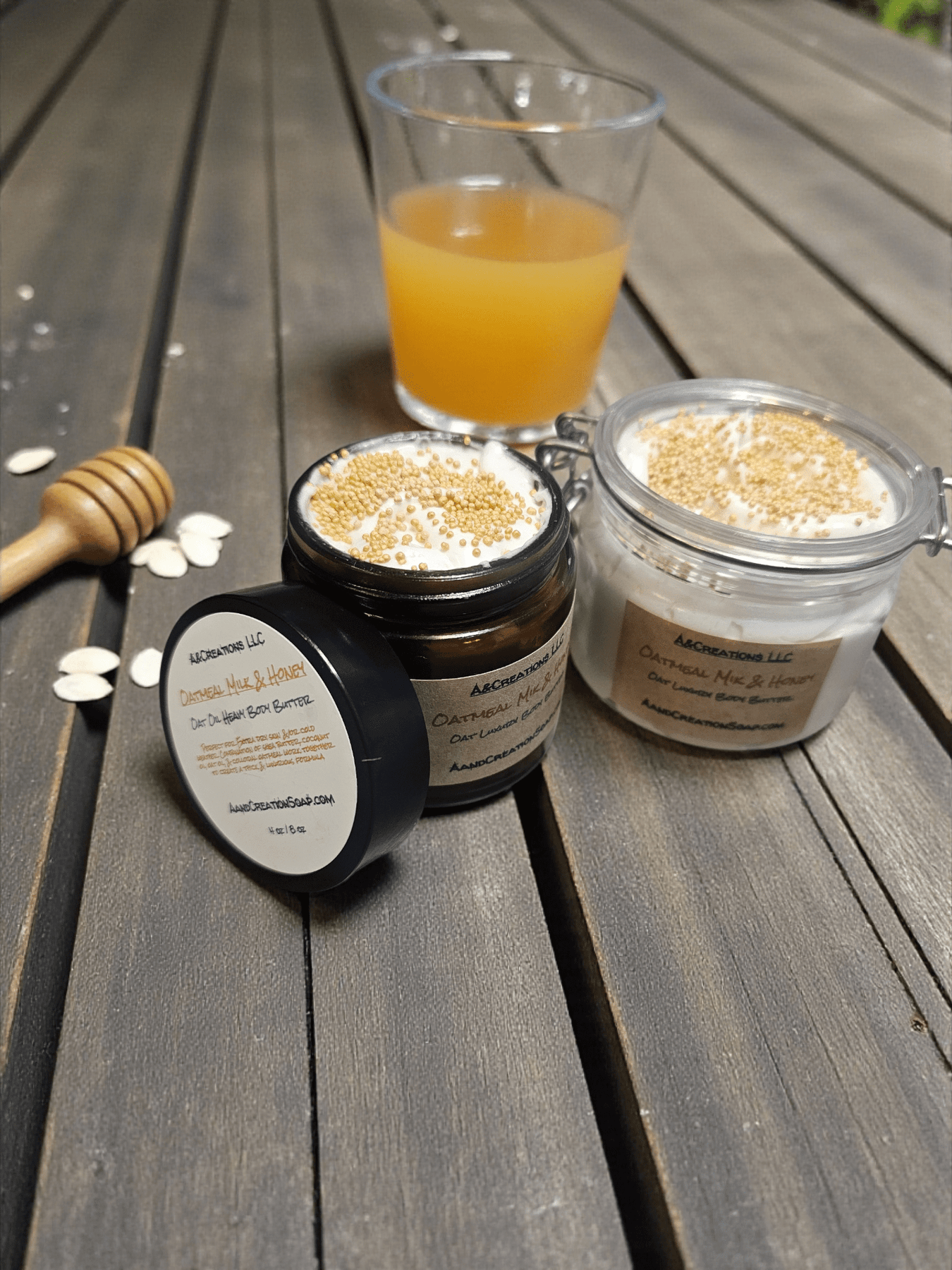 Ingredients: Shea butter, coconut oil, oat oil, oat extract, arrowroot powder, pure honey fragrance, Oatmeal Milk ans honey fragrance oil, gold bursting beads