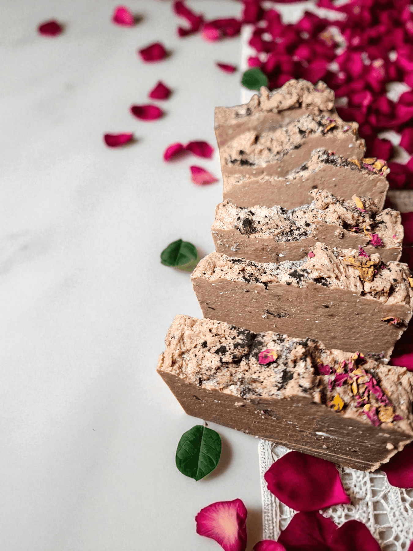 Rosey Day Goats Milk Soap Ingredients: olive oil. Coconut oil, palm oil, Castor oil, canola oil, vitamin E oil, cocoa butter, Mango butter, goats milk, lye, rose clay, activated charcoal, magenta Mica, fragrance oils, dried rose petals, rose water